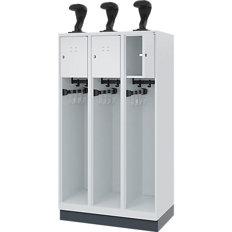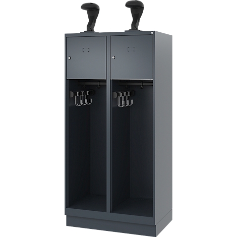 Brandweerkluis C+P Evolo Youngster, 1 vak, met helmhouder, met sokkel, B 300 x D 500 x H 1630 mm, RAL 7035 lichtgrijs/RAL 7016 antracietgrijs