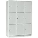 Vakkenkast 300 mm, 3 compartimenten, 9 vakken, veiligheidscilinderslot, poot, lichtgrijs